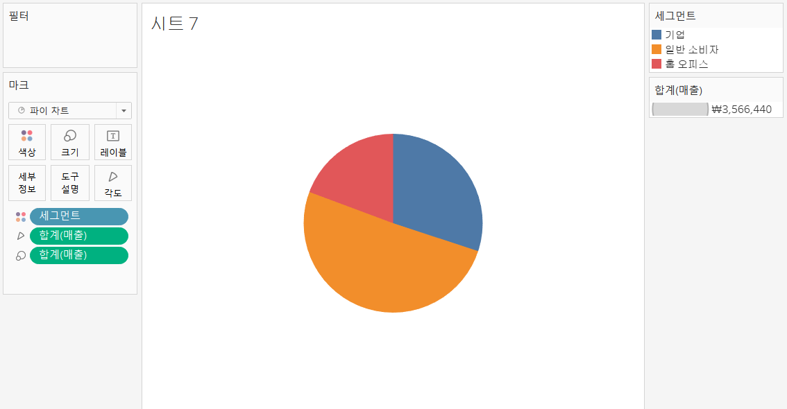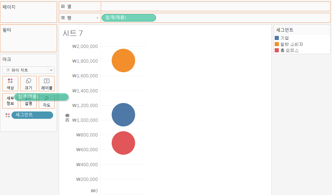 행 선반에 있던 합계(매출)을 마크의 '각도'에 드래그 해주게 되면
