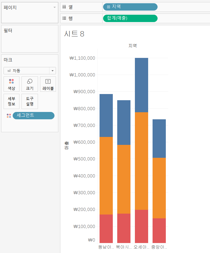 세그먼트별 매출을 지역별로 나타내보기 위해 지역을 열선반에 올려주었습니다.