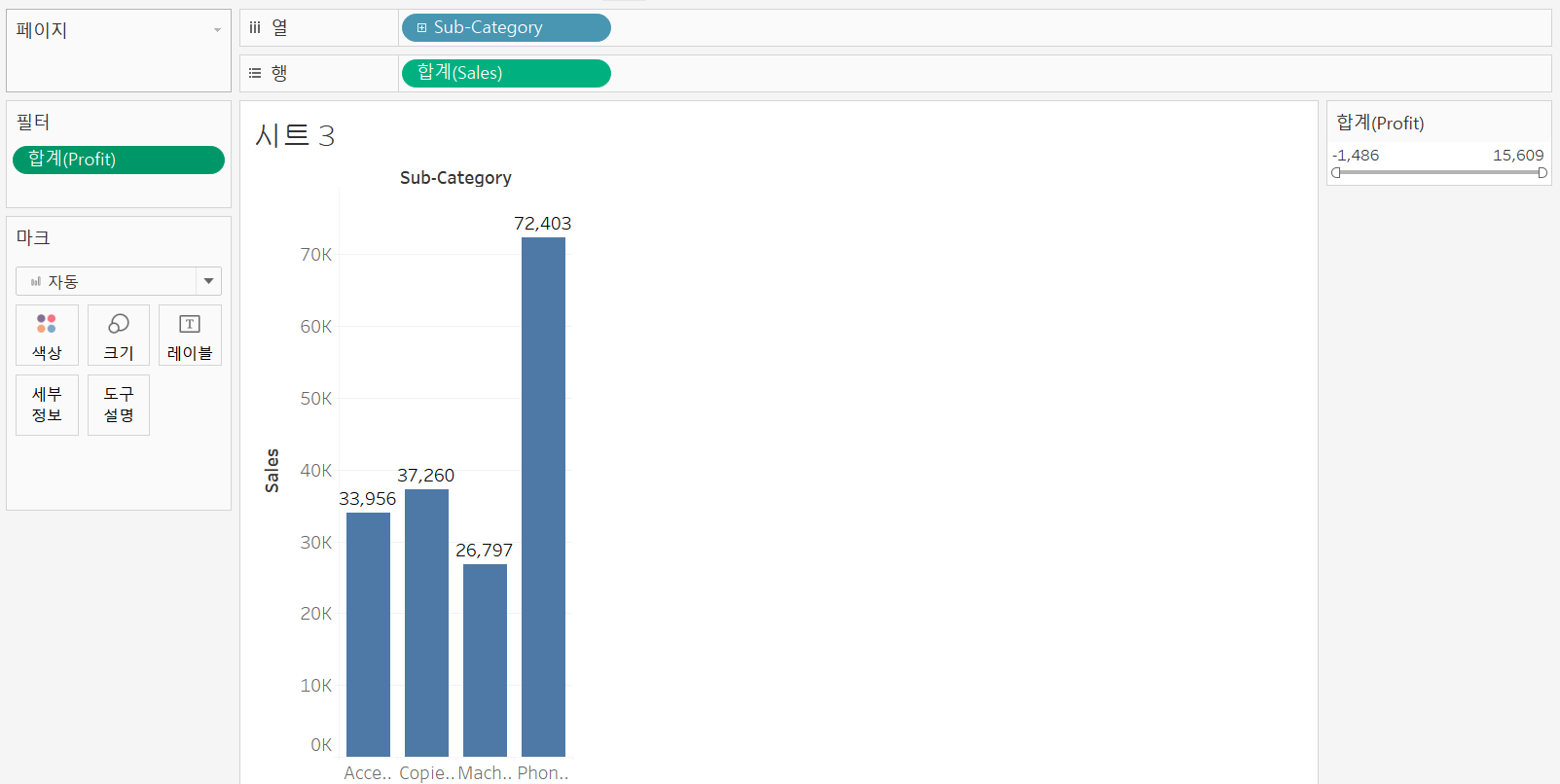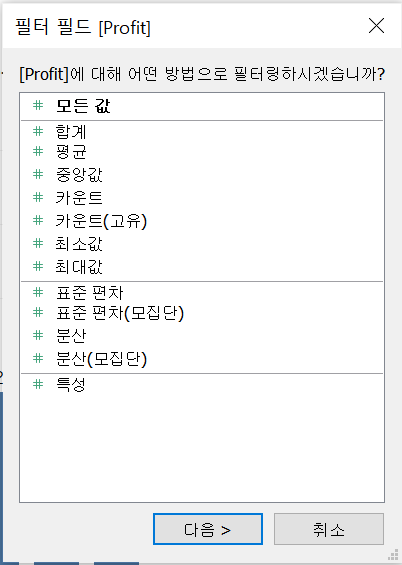 여기서 저는 [합계]를 눌러주었고, profit의 합계값의 최소-최대 값 범위를 보여줍니다.