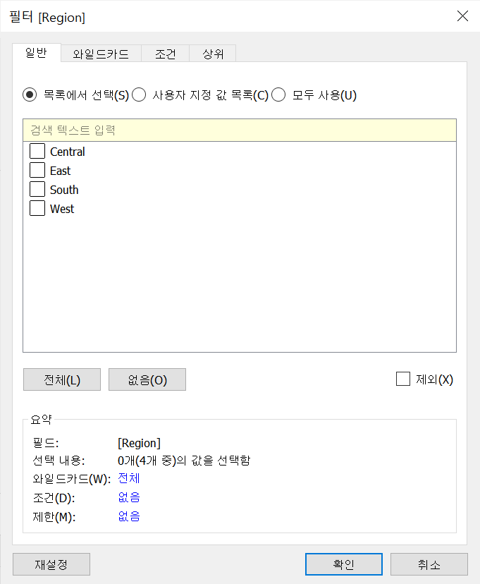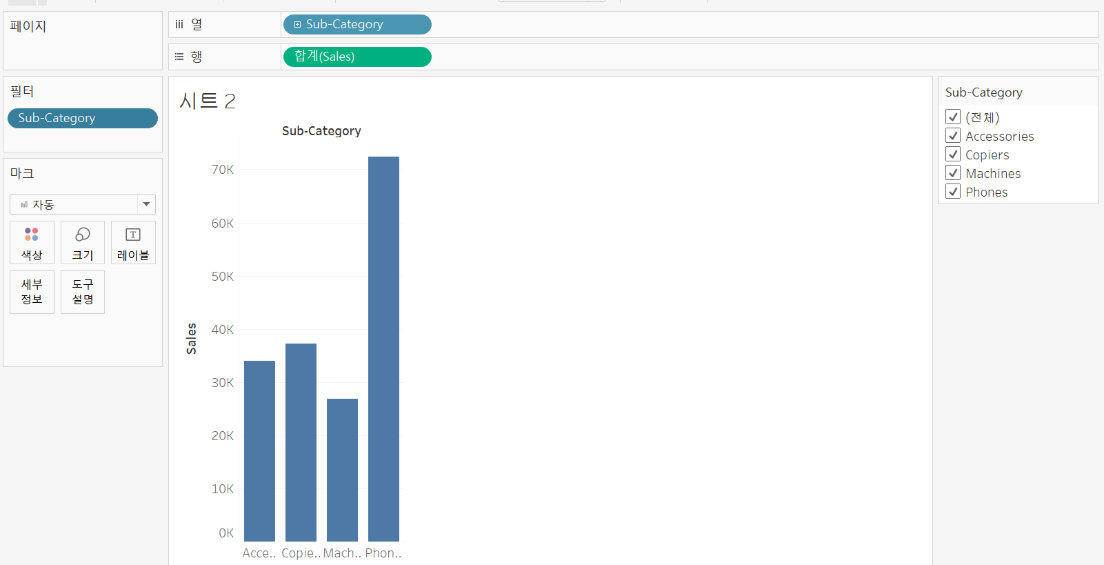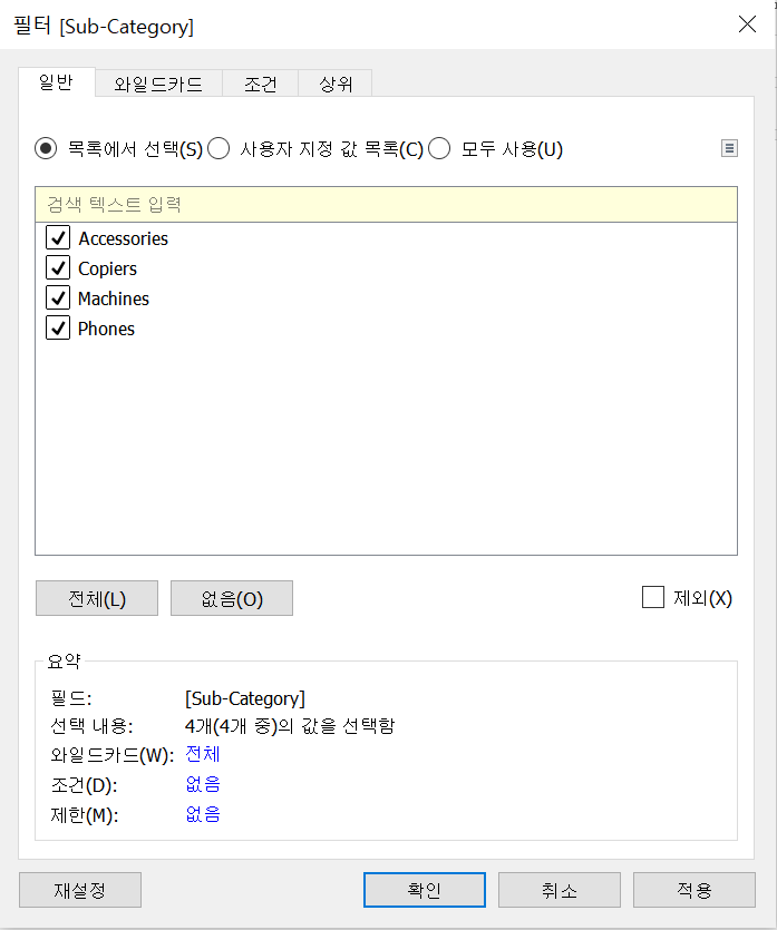 sub-category를 필터에 드래그 한 경우 아래와 같은 창을 마주할 수 있는데요