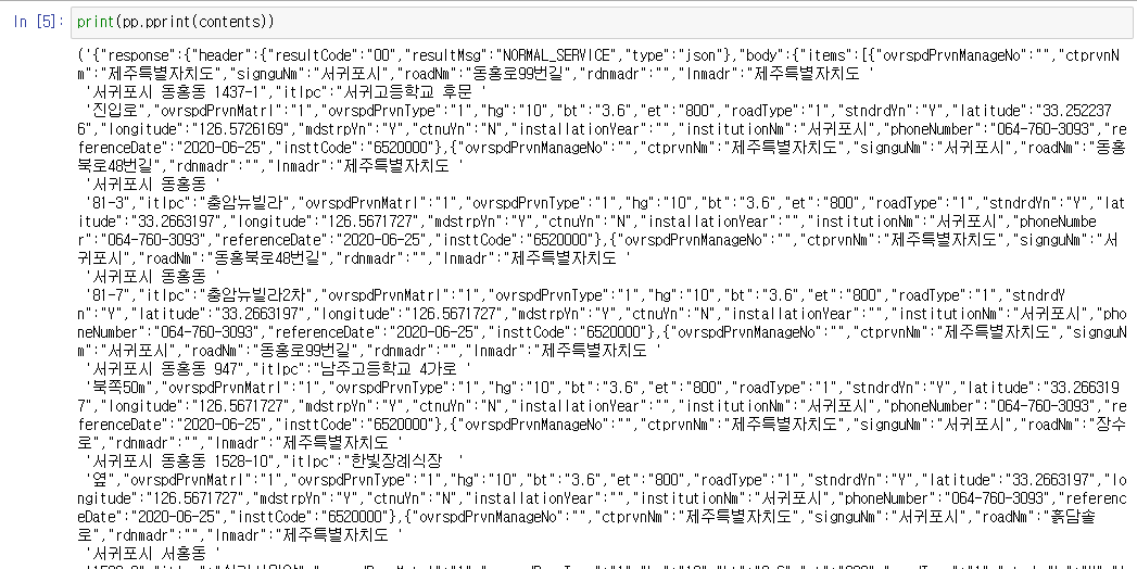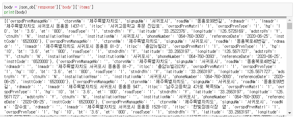 출력된 값을 자세히 살펴보면 response -> body -> body 속 items에 원하는 정보가 모두 포함된 것을 볼 수 있다