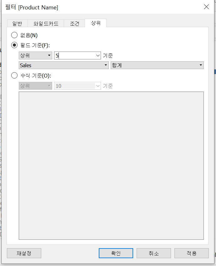 좌측 필터에 product name을 drop하고 아래와 같이 상위 5개를 기준으로 설정해줍니다.