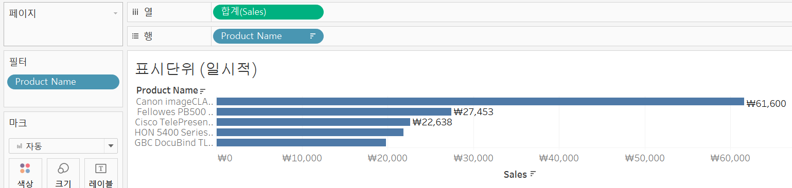 본 예시는 product name별 sales를 알아보는 막대그래프를 활용하여 진행합니다.