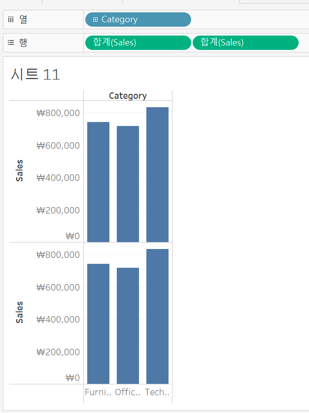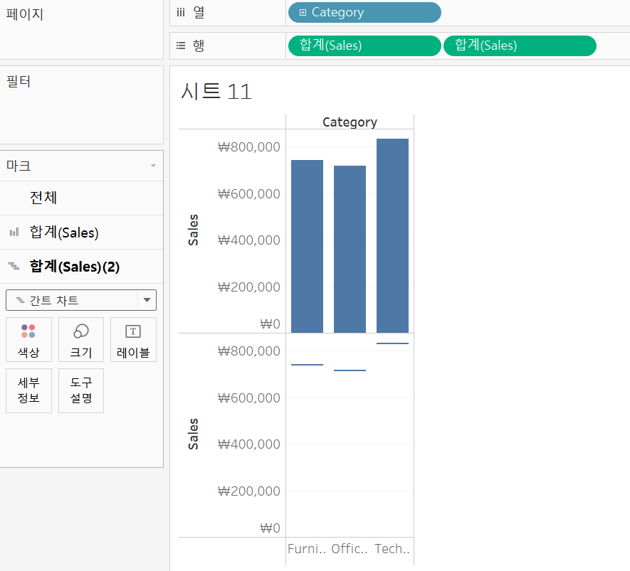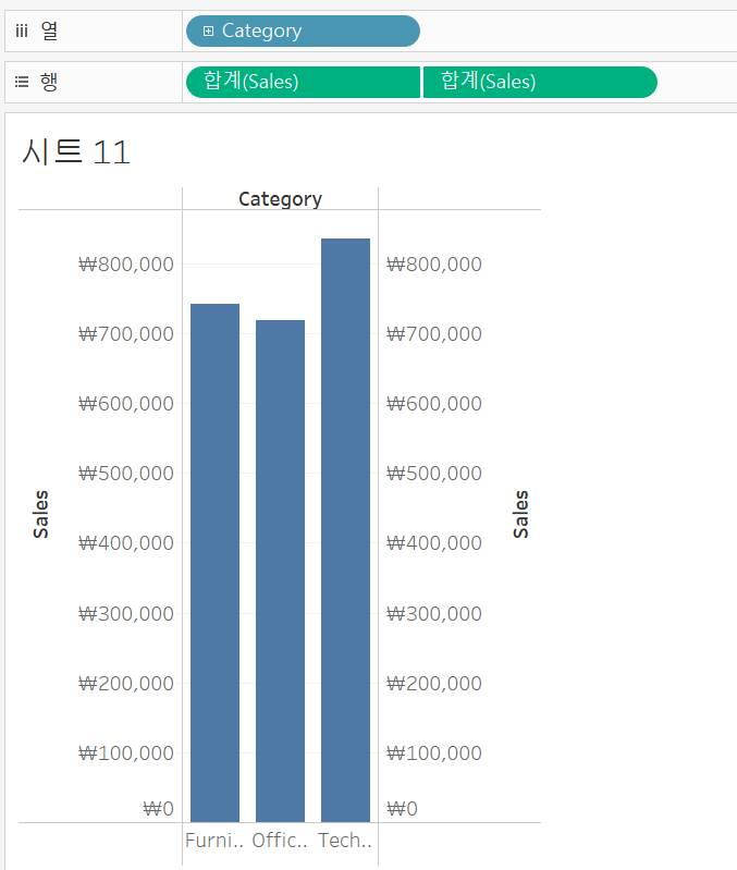 우선 이중축을 나타내기 위해서, 행에 동일한 sales를 두개 얹어줍니다.