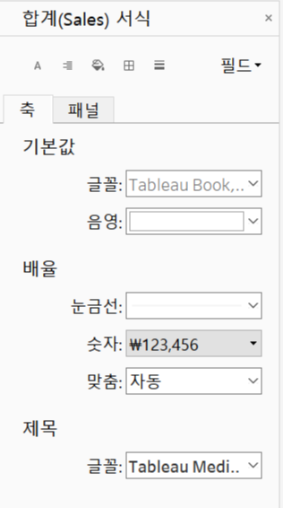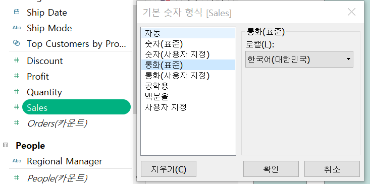 속성이 아닌 좌측의 데이터 탭 sales의 '기본설정'에서 -> 숫자형식을 통해 원화로 형식을 변경하는 경우
