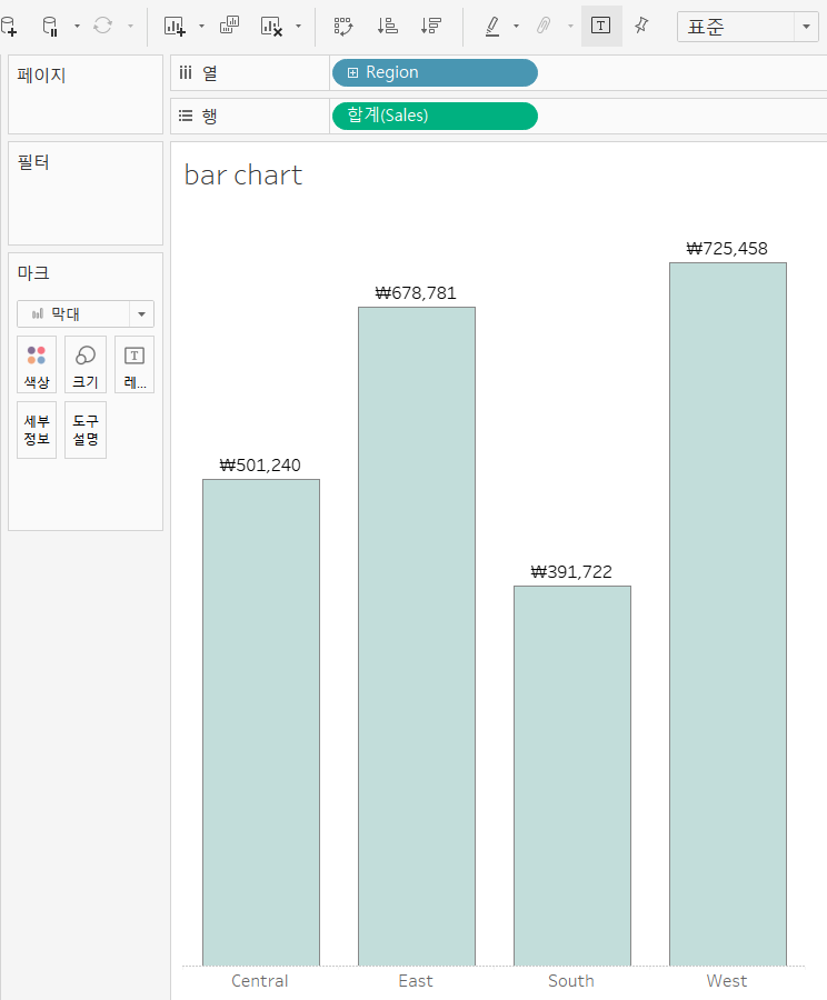 해당 차트의 경우 4년치 매출의 합계를 region별로 나누어 보겠다고 할 수 있겠습니다.