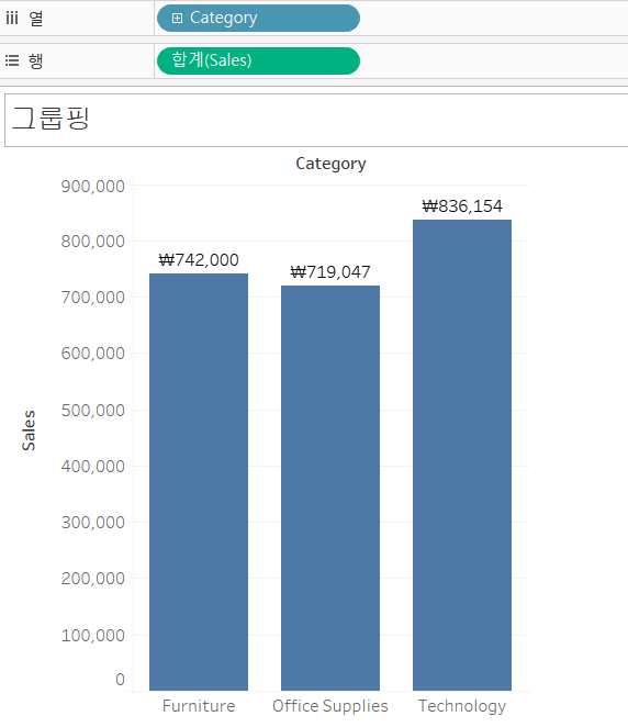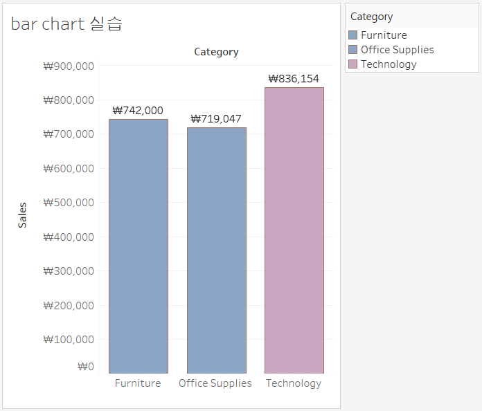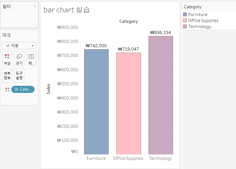 category 차원을 기준으로 sales의 합계를 분류한 막대 그래프입니다.