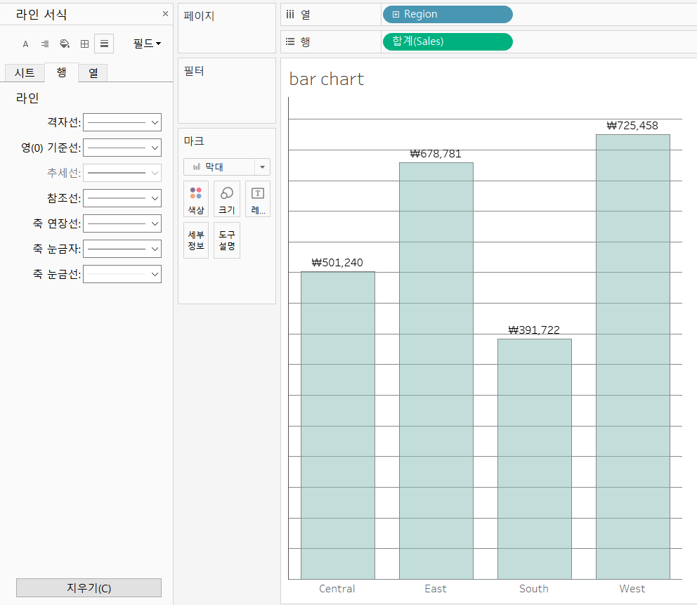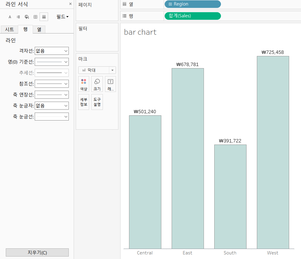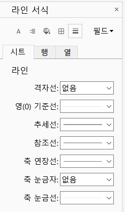 행 카테고리에서 격자선, 축 눈금자를 '없음'으로 바꾸어주고,